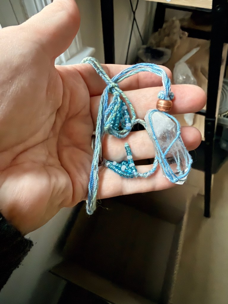 I bought embroidery floss at Michael’s and wrapped my second crystal. I learned that I made the first one harder than it had to be and that my natural crystal beads (which I’d found going through office boxes) didn’t have holes large enough to string above the quartz.